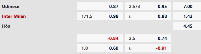 Inter thắng theo châu Á hiệp 1: Cả 3 trận Serie A gần đây khi được nhường 3/4 bàn trở lên, Udinese đều bị dẫn bàn trong hiệp 1. Trong 7 trận chính thức vừa qua khi nhường đối phương 1 bàn trở lên, 6 lần Inter thắng đối phương trong 45 phút đầu. Nerazzurri cũng dẫn bàn hiệp 1 cả 4 lần gần nhất chạm trán Udinese tại Serie A.