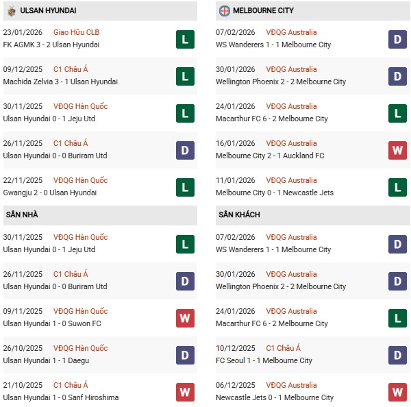 Phong độ gần đây của Ulsan HD lại không thực sự khả quan khi thắng 2, hòa 2 và thua 6 trong 10 trận gần nhất trên mọi đấu trường. Dù vậy, sân nhà vẫn là điểm tựa đáng tin cậy khi Ulsan HD sở hữu thành tích 5 chiến thắng, 3 trận hòa và 2 thất bại trong 10 trận gần đây. Lợi thế này được kỳ vọng sẽ giúp đội chủ nhà chơi chủ động hơn trước Melbourne City.