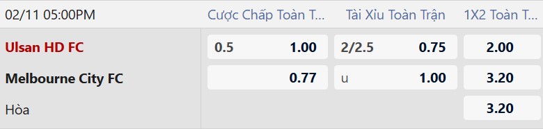 Thông tin tỷ lệ cược Ulsan HD vs Melbourne City: