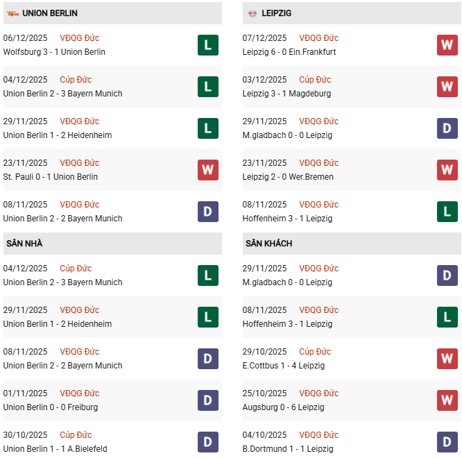 - Trên sân nhà, Union Berlin thắng 4, thua 2 trước Leipzig.
