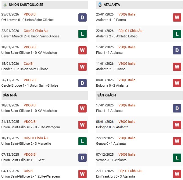 Thống kê phong độ Union SG vs Atalanta: