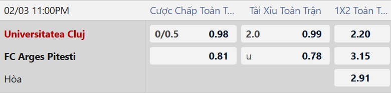 Thông tin tỷ lệ cược Universitatea Cluj vs Arges: