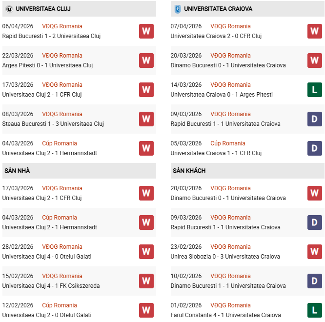 - Trên sân nhà, Universitatea Cluj thắng 1, thua 1 trước Craiova.