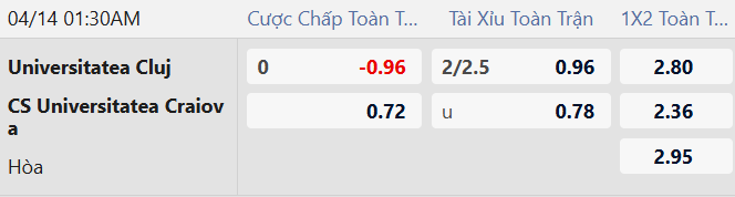 Thông tin tỷ lệ Universitatea Cluj vs Craiova: