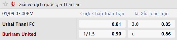 Thông tin tỷ lệ cược Uthai Thani vs Buriram: