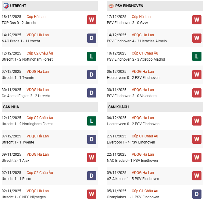 Thống kê phong độ Utrecht vs PSV Eindhoven: