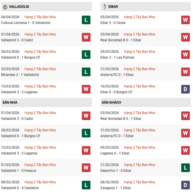 Thống kê phong độ Valladolid vs Eibar: