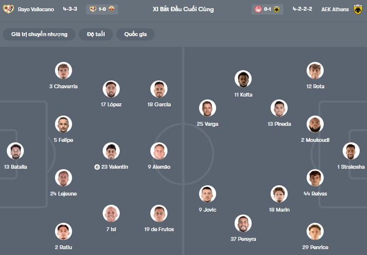 Đội hình dự kiến Vallecano vs AEK Athens: