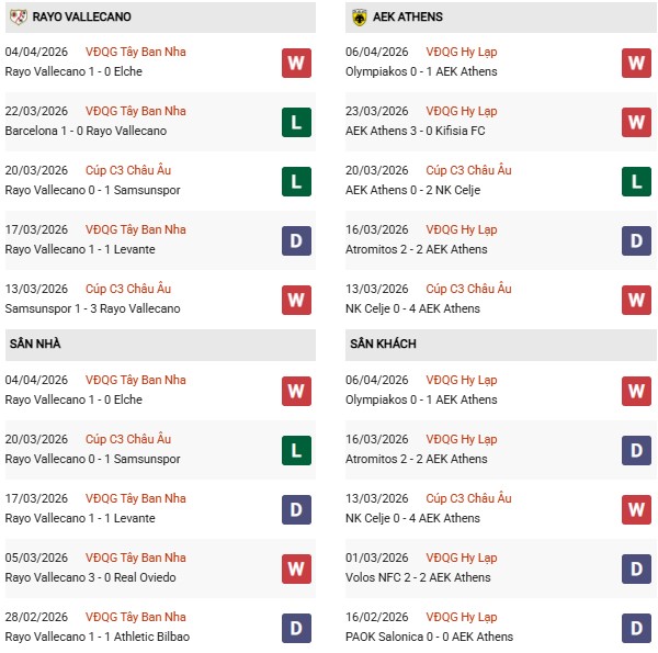 Ở phía đối diện, AEK Athens cũng cho thấy sự lì lợm đáng nể. Thầy trò HLV Marko Nikolić thắng 3, hòa 1 và chỉ thua 1 ở 5 trận gần nhất. Đáng chú ý, phong độ sân khách của AEK khá ổn khi bất bại 5 chuyến xa nhà gần đây, trong đó có chiến thắng quan trọng 1-0 trước Olympiakos. Điều này cho thấy họ hoàn toàn đủ sức tạo ra thế trận khó chịu trước Vallecano.