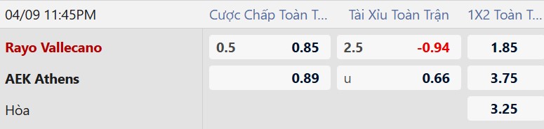 Thông tin tỷ lệ bóng đá Vallecano vs AEK Athens: