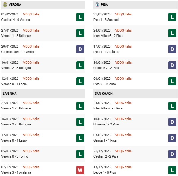 - Verona hòa cả 3 trận đối đầu Pisa gần đây.