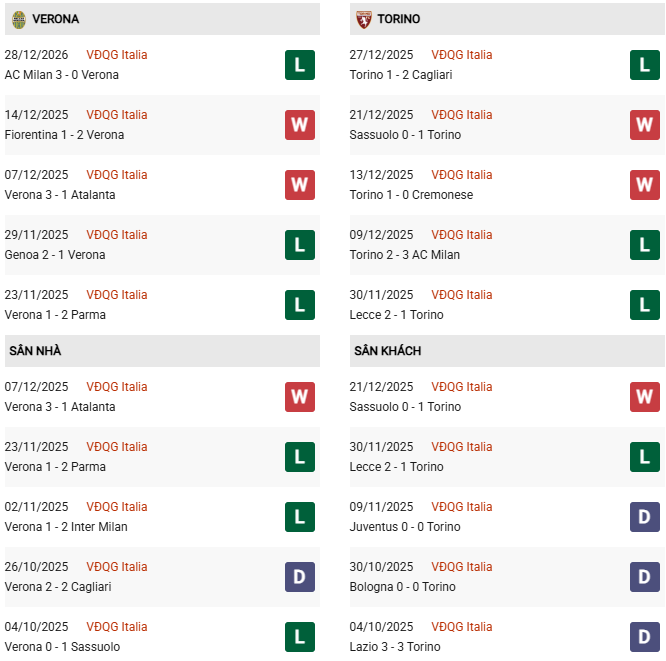 Thống kê phong độ Verona vs Torino: