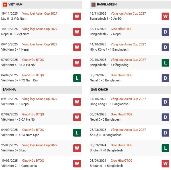 Thống kê phong độ Việt Nam vs Bangladesh: