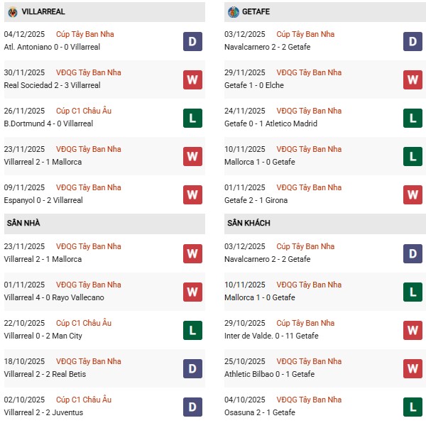 Số liệu thống kê đối đầu về Villarreal gặp Getafe:
