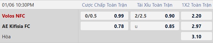 Thông tin tỷ lệ cược Volos vs Kifisia: