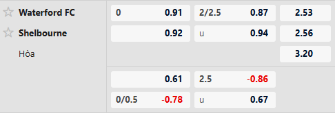 Mức kèo châu Á hiện đang là hòa được thua. Nếu đặt trong tương quan phong độ hiện tại, Waterford đang là đội nhỉnh hơn rõ rệt. Họ chơi tốt tại sân nhà với 3 chiến thắng trong 5 trận gần nhất, và từng đánh bại chính Shelbourne ngay trên sân khách chỉ cách đây hơn một tháng. Trong khi đó, Shelbourne không thắng 4/5 chuyến hành quân gần nhất, với màn trình diễn nghèo nàn ở khâu ghi bàn.