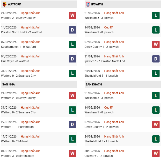 Thống kê phong độ Watford vs Ipswich: