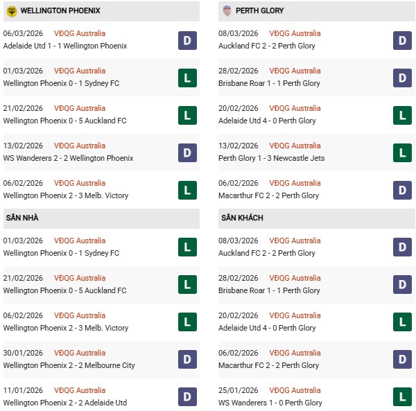 Ở 5 cuộc đụng độ Wellington Phoenix gần đây, có đến 3 lần Perth Glory buộc đối phương phải chia điểm. Do cả Perth Glory lẫn Wellington Phoenix đều đang gặp vấn đề về phong độ, rất có thể kịch bản 2 đội cầm chân nhau sẽ lại một lần nữa xảy ra.