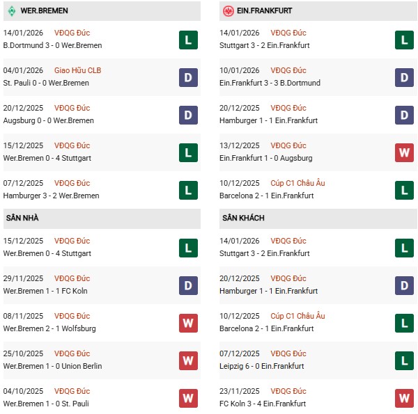 - Trên sân nhà, Werder Bremen thắng 5, thua 3 trước Frankfurt.