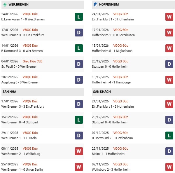 - Trên sân nhà, Werder Bremen thắng 1, thua 6 trước Hoffenheim.