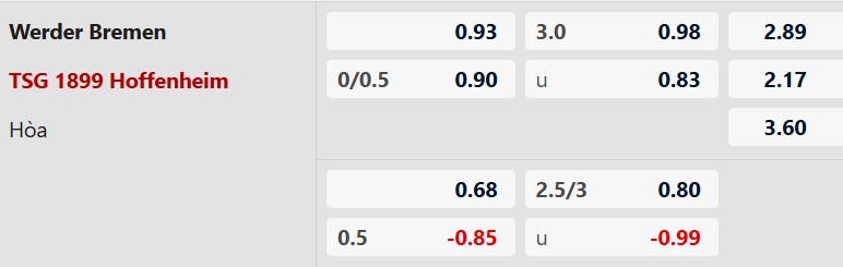Soi kèo châu Á Werder Bremen vs Hoffenheim: