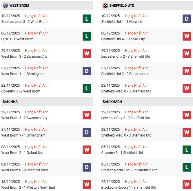Thống kê phong độ West Brom vs Sheffield United: