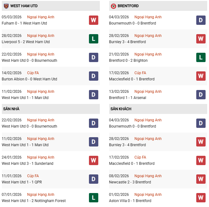 Thống kê phong độ West Ham vs Brentford: