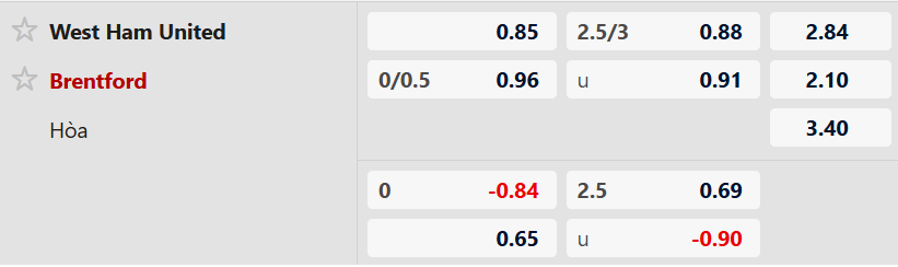 Thông tin tỷ lệ kèo West Ham vs Brentford:
