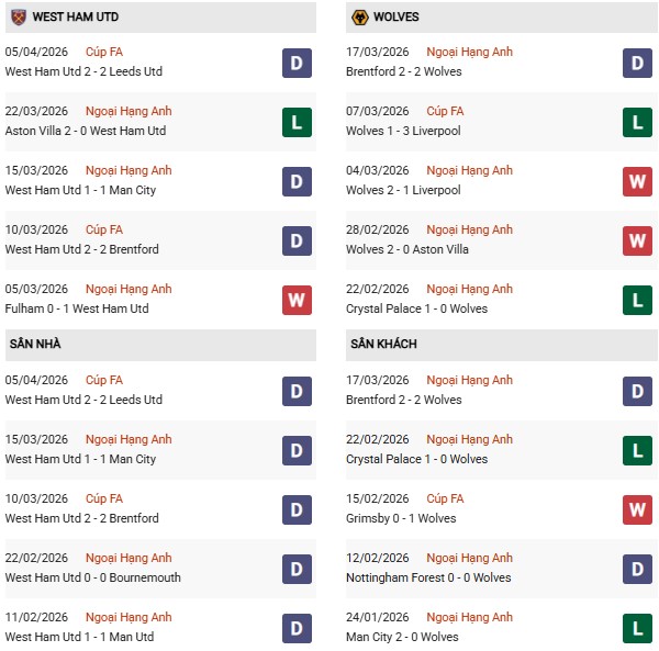 Thống kê phong độ West Ham vs Wolves: