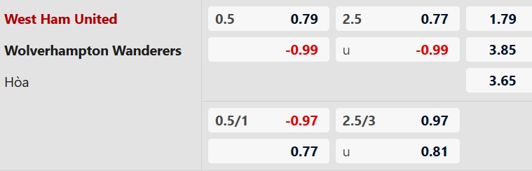 Thông tin tỷ lệ kèo bóng đá West Ham vs Wolves: