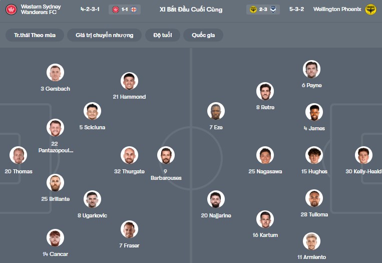 Số liệu thống kê về Western Sydney gặp Wellington: