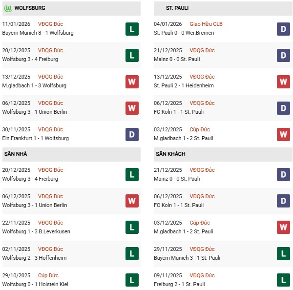 - Wolfsburg thắng 2, hòa 4. thua 2 trong 8 trận gặp St.Pauli gần đây.
