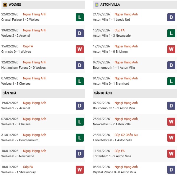 Hơn nữa, nếu tính riêng 6 trận gần nhất đón tiếp Aston Villa trên sân nhà tại Ngoại hạng Anh, Wolves thắng 4, hòa 1 và chỉ thua 1. Ngoài ra, việc vừa cầm hòa Arsenal 2-2 trên sân nhà cách đây 2 vòng cũng là động lực để họ nuôi hy vọng giành điểm trước đội bóng có trụ sở ở Birmingham.