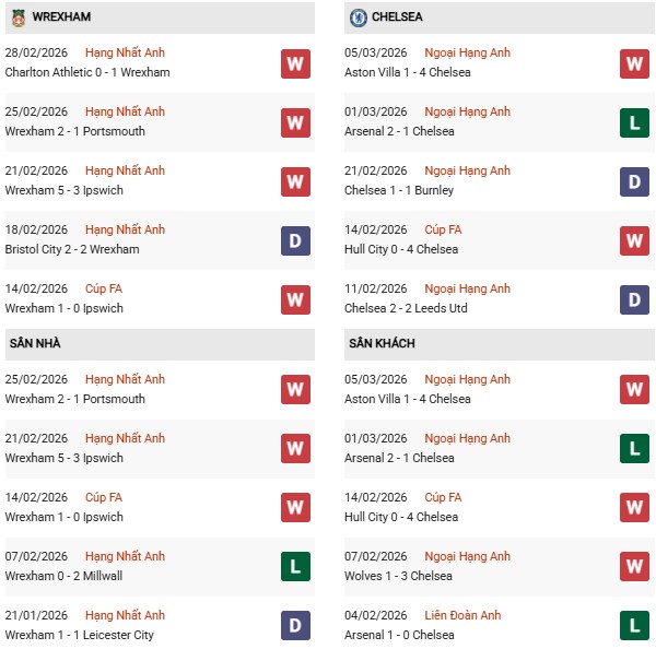 - Wrexham hòa 1, thua 1 trong 2 trận gặp Chelsea gần đây.