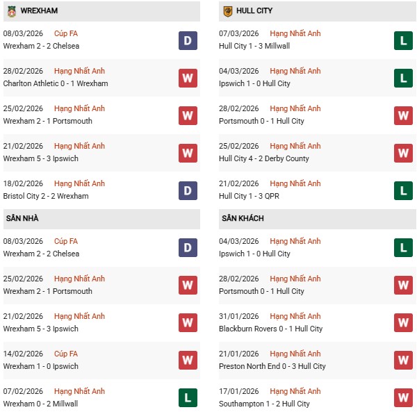 - Trên sân nhà, Wrexham hòa cả 2 trận trước Hull City.