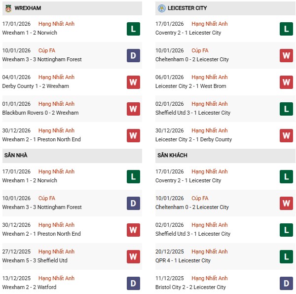 Cuối tuần vừa rồi, Leicester đã không thể tạo bất ngờ trước Coventry đầu bảng và đó là thất bại thứ 4 của đội bóng này trong phạm vi 6 vòng gần đây tại Championship (3 trên sân khách). Nhưng nói gì thì nói giữa đôi bên vẫn là cách biệt đáng kể về mặt đẳng cấp lẫn bản lĩnh - thứ chắc chắn cần được tích lũy qua thời gian nên phần thua thiệt phải thuộc về Wrexham. Tựu trung lại, hoàn toàn có thể tin vào khả năng Leicester mang điểm số về nhà.