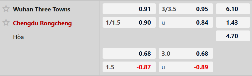 Thông tin tỷ lệ Wuhan Three Towns vs Chengdu Rongcheng: