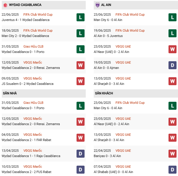 Thống kê phong độ Wydad Casablanca vs Al Ain: