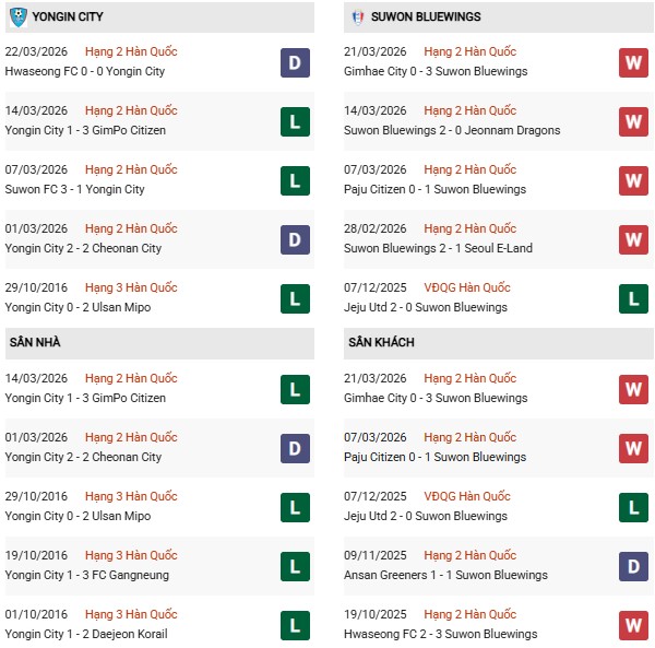 Thống kê phong độ Yongin vs Suwon Bluewings:
