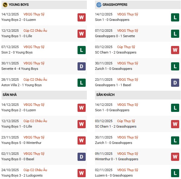 Ở chiều ngược lại, Grasshopper đang đứng thứ 11 với vỏn vẹn 14 điểm sau 17 vòng, kém vị trí cuối cùng dự vòng Vô địch của Lugano tới 13 điểm. Thành tích 3 thắng, 5 hòa và 9 thua phản ánh rõ những vấn đề của đội khách từ đầu mùa, đặc biệt là sự thiếu ổn định trong cả tấn công lẫn phòng ngự. Phong độ 10 trận gần nhất của Grasshopper không mấy sáng sủa với chỉ 2 chiến thắng, 2 trận hòa và tới 6 thất bại. Dù thành tích sân khách của họ không quá tệ với 4 thắng, 1 hòa và 5 thua trong 10 chuyến xa nhà gần đây, nhưng việc phải làm khách trước một Young Boys rất mạnh tại sân nhà vẫn là thử thách lớn.