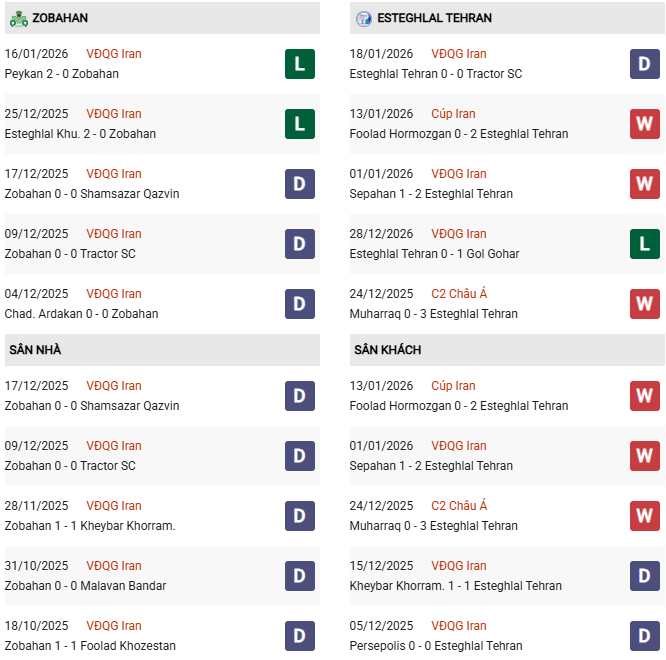 - Zob Ahan thắng 1, hòa 3, thua 6 trong 10 trận gặp Esteghlal gần đây.