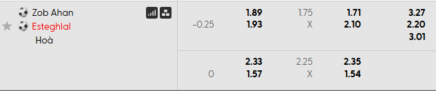 Thông tin tỷ lệ Zob Ahan vs Esteghlal: