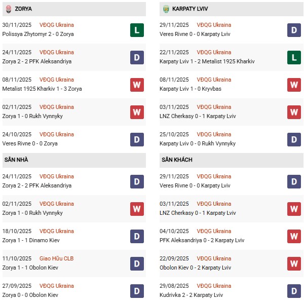 Thống kê phong độ Zorya vs Karpaty Lviv: