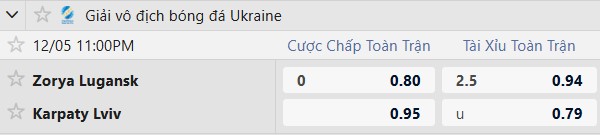 Thông tin tỷ lệ cược Zorya vs Karpaty Lviv: