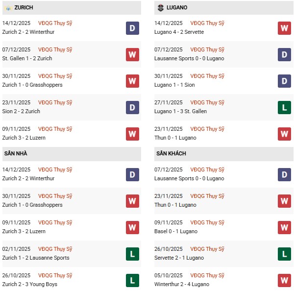 Ở chiều ngược lại, Lugano bước vào vòng đấu này với vị trí thứ 6 và 27 điểm trong tay. Khoảng cách 7 điểm so với ngôi đầu của Thun là không dễ san lấp, nhưng mục tiêu giữ chỗ trong top 6 rõ ràng nằm trong tầm tay của đội khách. Phong độ thời gian qua của Lugano khá ấn tượng với 6 chiến thắng, 2 trận hòa và chỉ 2 thất bại trong 10 trận gần nhất. Trên sân khách, Lugano vẫn duy trì được sự cân bằng với 5 thắng, 1 hòa và 4 thua trong 10 chuyến hành quân gần đây, đủ để tạo sự tự tin khi làm khách của Zurich.